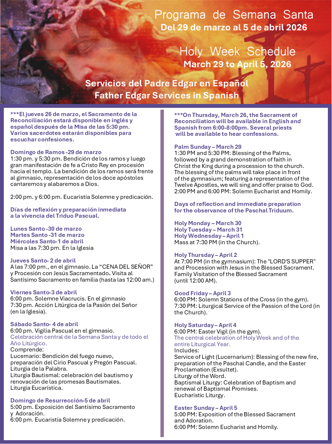 - 7:00 pm: Mass of the Lord's Supper (Spanish) (Gym)